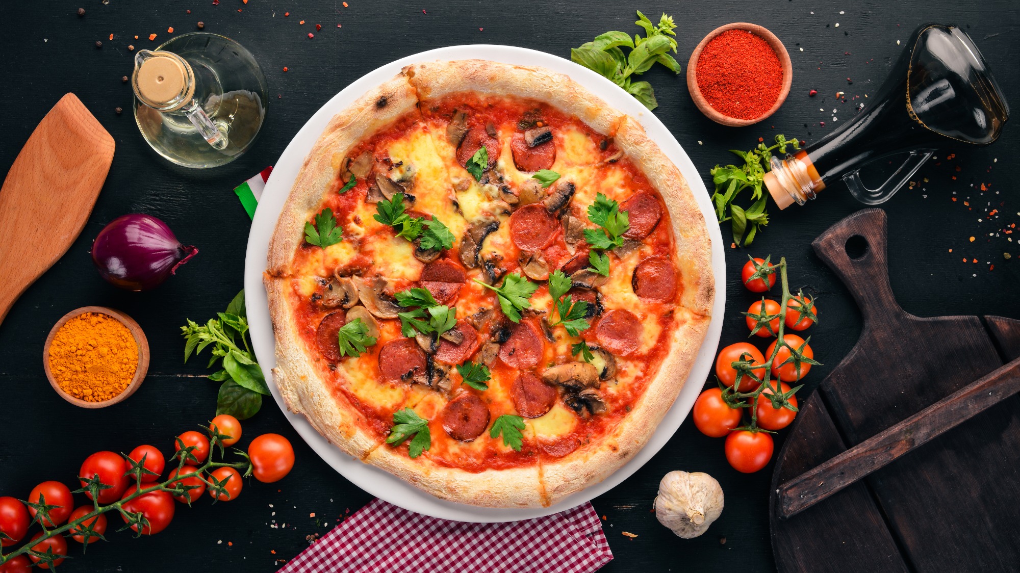 420gr - blat pizza, sos de roșii, cașcaval vegetal, ciuperci, roșii, ceapă, porumb, măsline, condimente